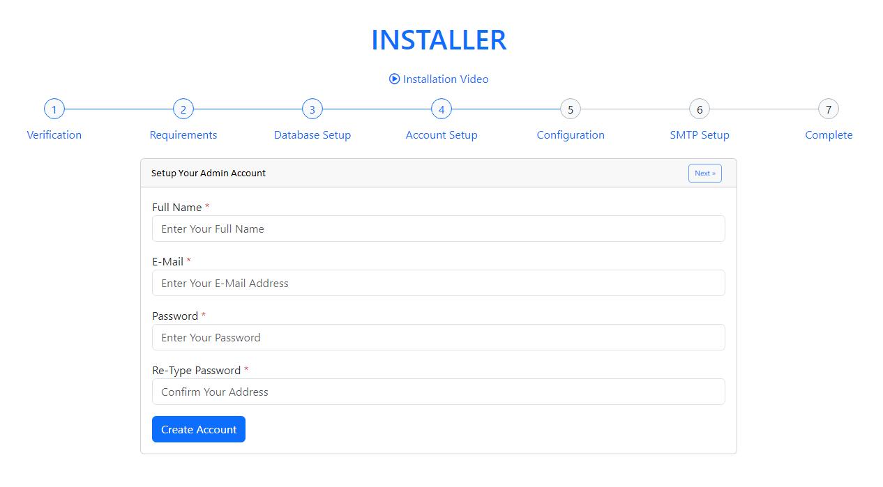 5. Fill Up all information and create an Admin Account. Press the 'Create Account' button to proceed to the next step.