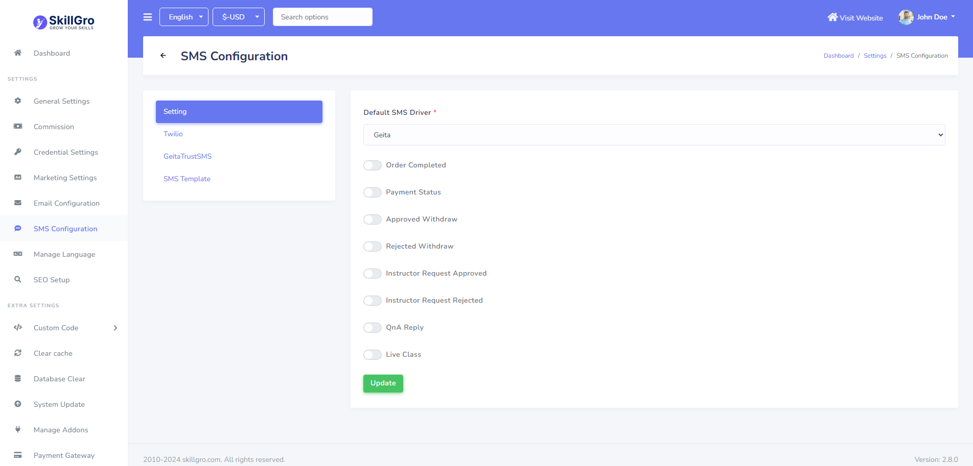 SMS configuration can be set up from the admin panel. Go to "Setting >> SMS configuration". See: