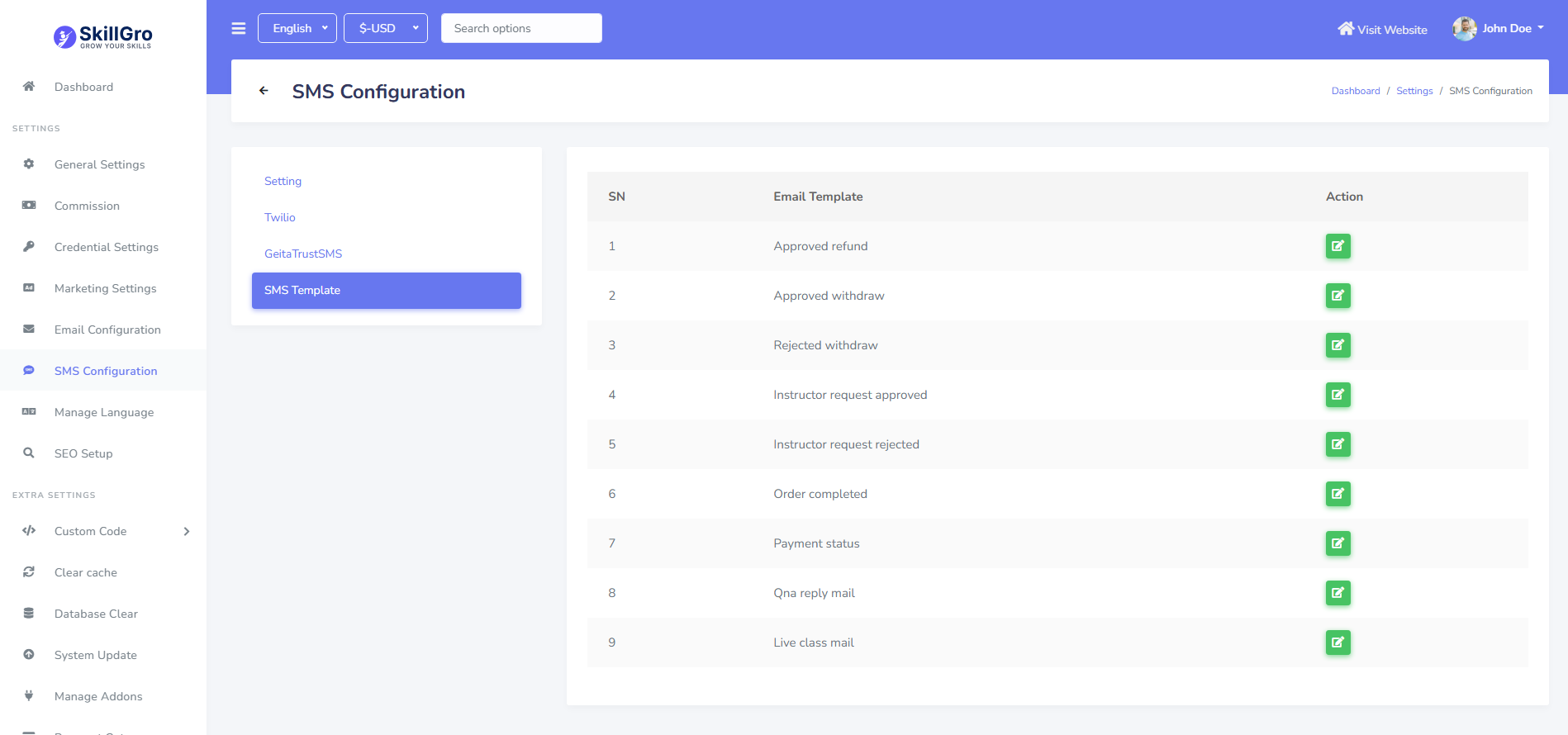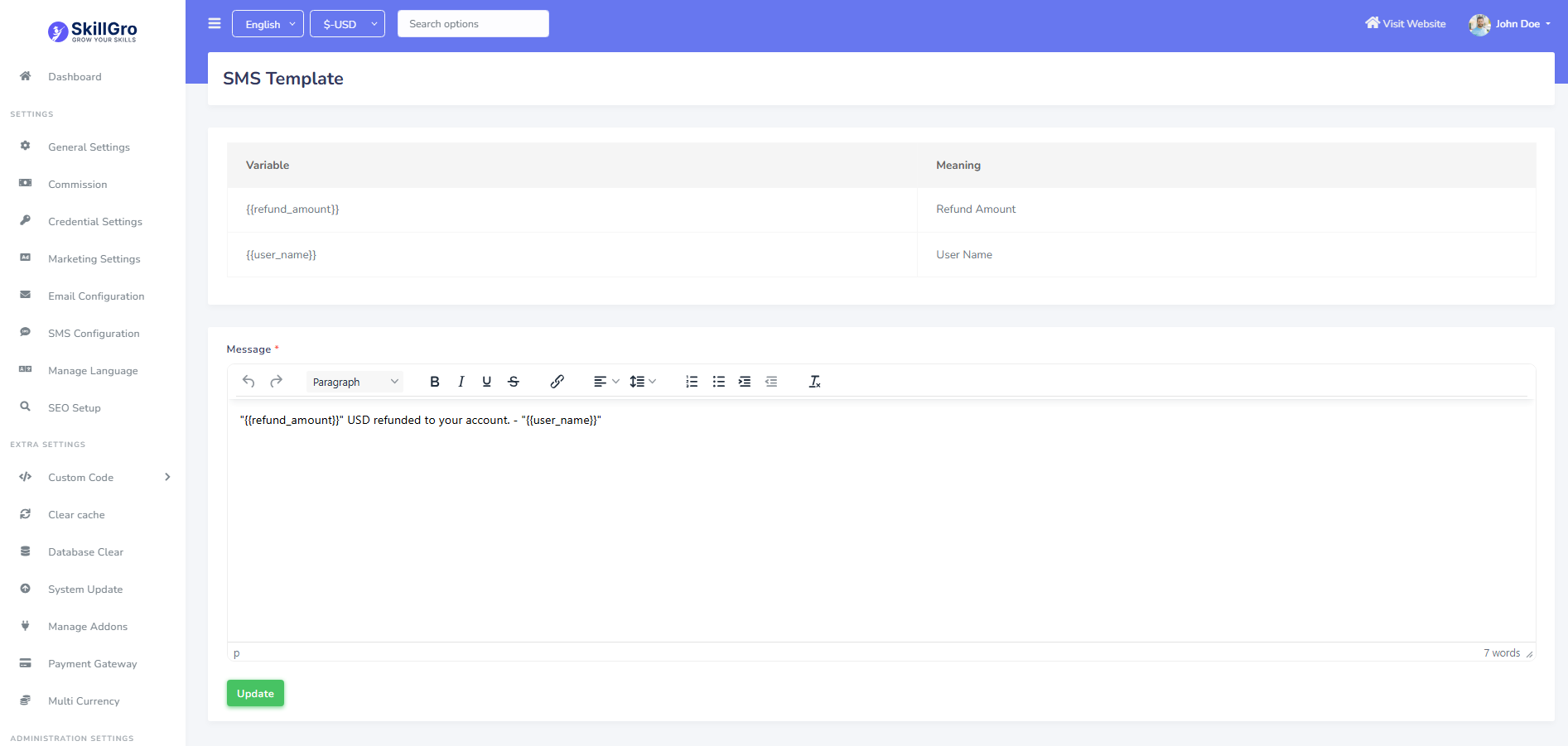 SMS template can be set up from the admin panel. Go to "Setting >> SMS configuration >> SMS template". See: