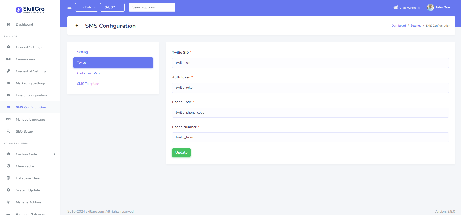 Twilio SMS gateway configuration can be set up from the admin panel. Go to "Setting >> SMS configuration >> Twilio". See: